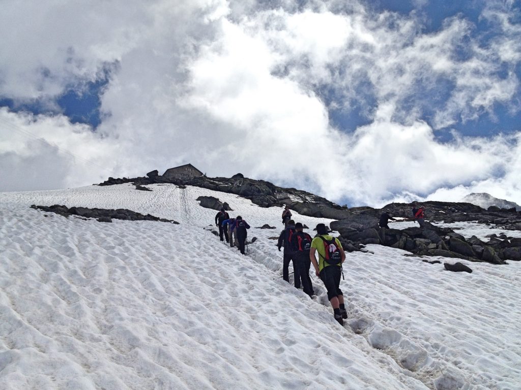 Heute geht es über den Mittelbergferner zur Braunschweiger Hütte (2.759m).  Der Weg gewinnt schnell an Steilheit und kreuzt mitunter breite Pistenwege. Immer wieder müssen wir kleinere Kletterstellen überwinden und werden dafür mit atemberaubenden Ausblicken belohnt.