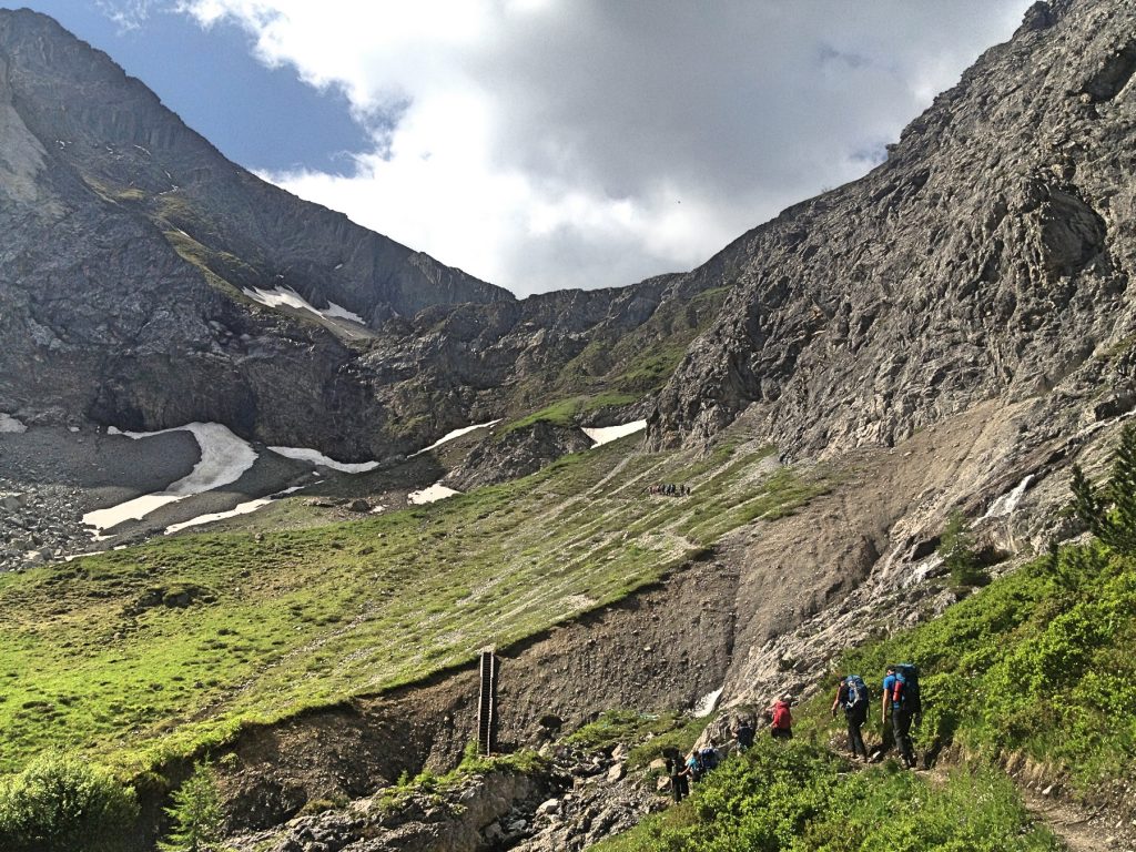 Heute geht es ein kurzes Stück mit dem Bus ins Kaisertal. Bei strahlendem Sonnenschein starten wir unseren Aufstieg zum Kaiserjochhaus (2.310m). Es ist mühselig und steil, aber es fällt mir schon wesentlich leichter, die Höhenmeter zu überwinden, als am ersten Tag. Wieder merken wir, dass wir mit Ende Juni eine der ersten Gruppen sind, die sich der Alpenüberquerung zu Fuß stellen. Laut unserem Bergführer trifft man hier bereits wenige Wochen später auf zahlreiche Wandergruppen.